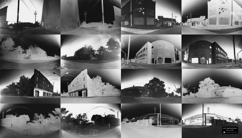 The process I chose, pinhole photography, is one rooted in careful consideration of the environment. I watched the sky for clouds and counted the seconds of each exposure. The images created using the camera were negatives, which I then contact printed in the darkroom to create positives. Off-Broadway features 8 pairs of negative and positive prints. The prints possess a dreamlike quality furthered by the shape of the camera, which was created using a cylindrical oatmeal container that imparts a wide-angle view.