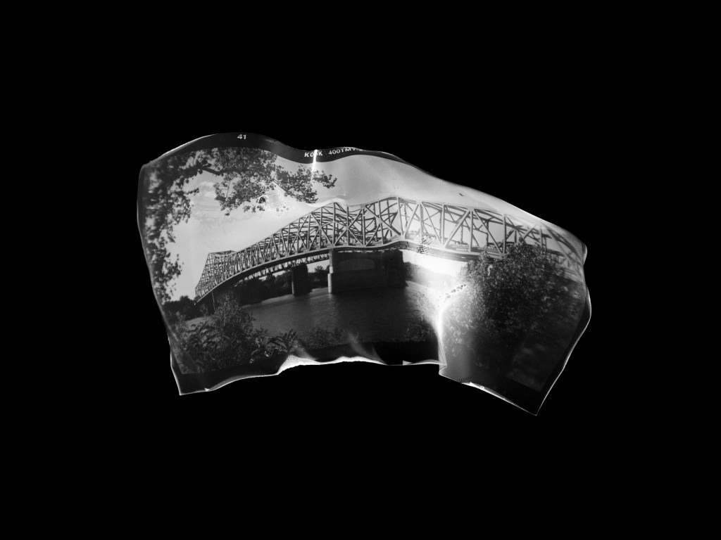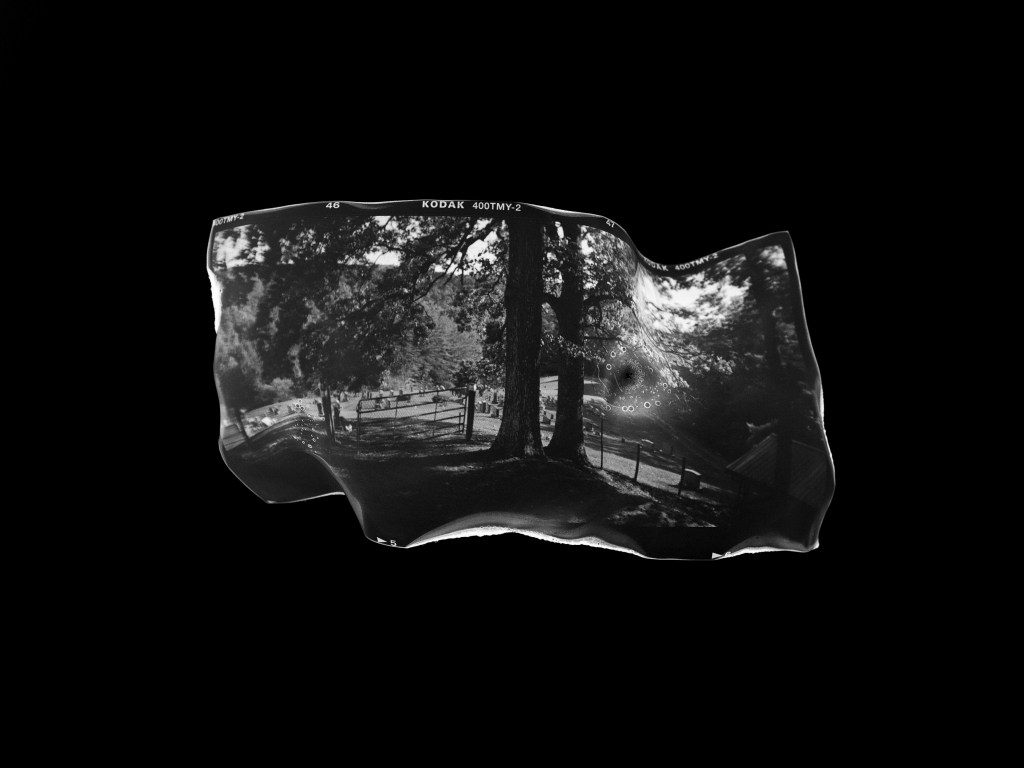 images depicting sites where Betty and Jack’s lives intersected. The larger film surface area was crucial because after developing the rolls, I engaged in an experimental process of attempting to strategically burn parts of the negatives using an open flame. The gnarled negatives were then rephotographed atop a light table.