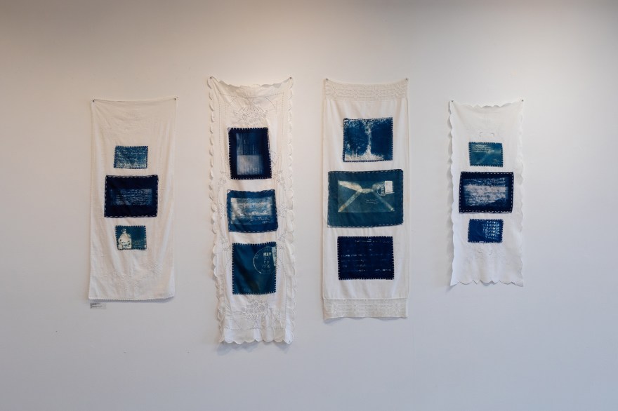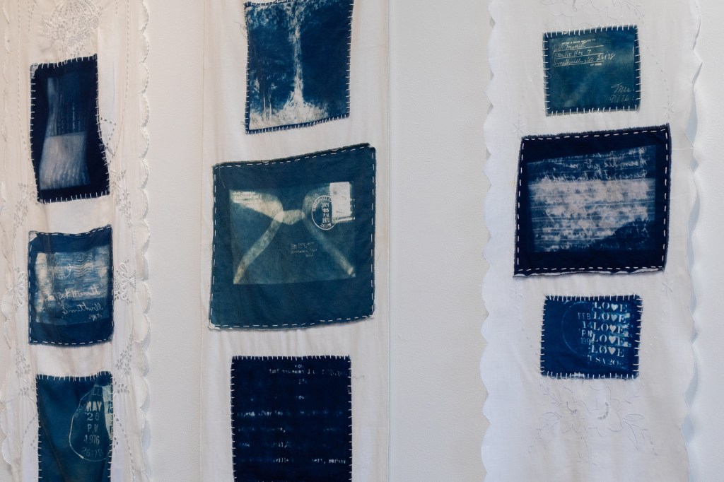 I also expanded my creative practice by incorporating organic materials into the work that I foraged in Ohio and West Virginia. I printed images of the letters themselves onto cotton sateen using cyanotype chemistry and toned the fabric with natural dye baths of buckeye, oak, and sumac. The inclusion of the cyanotypes, delicately stitched onto found textile table runners, imbues the work with an intimate sense of domesticity and encourages a consideration of what we obscure or choose to reveal in our lives.