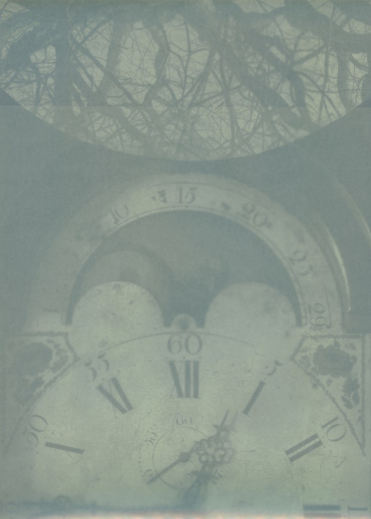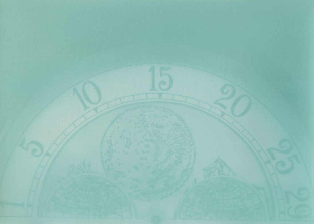 The lumens highlight Moses Cleaveland trees—majestic beings identified as being at least 150 years old at the time of Cleveland’s sesquicentennial in 1946. These trees are named after the surveyor who gave the city its name in 1796, though the spelling was later adjusted to remove the extra letter “a” from Cleveland. I printed digital negatives from photographs I took of these trees, along with vintage timepieces featuring celestial elements. I then contact-printed the negatives, sometimes adding botanical items, to make lumens on expired and fogged darkroom paper.